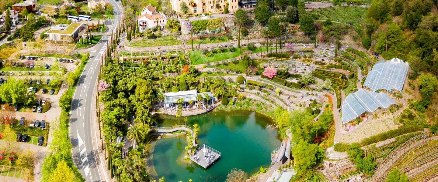 Die Gärten von Schloss Trauttmansdorff befinden sich in der Nähe der Stadt Meran in Südtirol, Italien, und sind von einer malerischen Berglandschaft umgeben. Geografisch liegen die Gärten am Hang des Tschögglbergs und bieten einen atemberaubenden Blick auf die umliegenden Berge und das Etschtal. Die Anreise zu den Gärten ist sowohl mit dem Auto als auch mit öffentlichen Verkehrsmitteln gut möglich, wobei die Region über gut ausgebaute Straßen und Busverbindungen verfügt. In der Umgebung gibt es zahlreiche Möglichkeiten für weitere Aktivitäten, darunter Wanderungen in den umliegenden Bergen, den Besuch der historischen Altstadt von Meran und die Erkundung der zahlreichen Weingüter der Region. Die Kombination aus einer zentralen Lage, der Schönheit der Natur und der Möglichkeit, die faszinierenden Gärten hautnah zu erleben, macht die Gärten von Schloss Trauttmansdorff zu einem unvergesslichen Erlebnis für alle, die diese einzigartige Destination entdecken möchten.